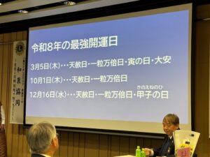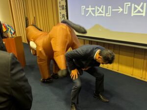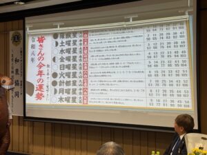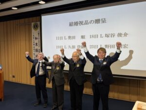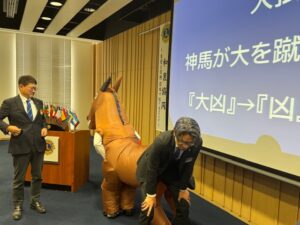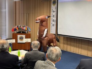 ■皆様あけましておめでとうございます。 令和8年の新春例会が開催されました。 新春例会は毎年、テール・ツイスターの活躍が楽しみですが、 今年はメンバーの今年の運勢を調査頂き、運勢が「黒色」のメンバーを ゲストの馬にけって頂きました。(これで「大凶」が「凶」になるそうです。) 「最強海運日」もお教えいただき、素晴らしい1年にできそうな気がします。 有難うございました。 又、詩吟の会の5名の皆様、「昇段」おめでとうございます。 あと半年、C.N.65周年 楽しみながら、頑張りましょう。