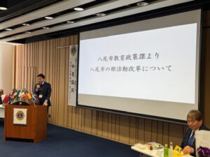 ■第1580回 TAX例会 本日は、八尾市教育委員会より事務局次長の川添様、教育政策課課長補佐の福井様、 一社)アクリル運動部スポーツクラブの稲垣様をゲストに迎え八尾市の「部活動改革」 のお話をして頂きました。 又、税理士のL中上より税金についてのお話を頂きました。 例会承認事項・上半期会計報告など盛りだくさんでした。 春になると、多くのC.N.65周年事業が始まります。協力して進めていきましょう。